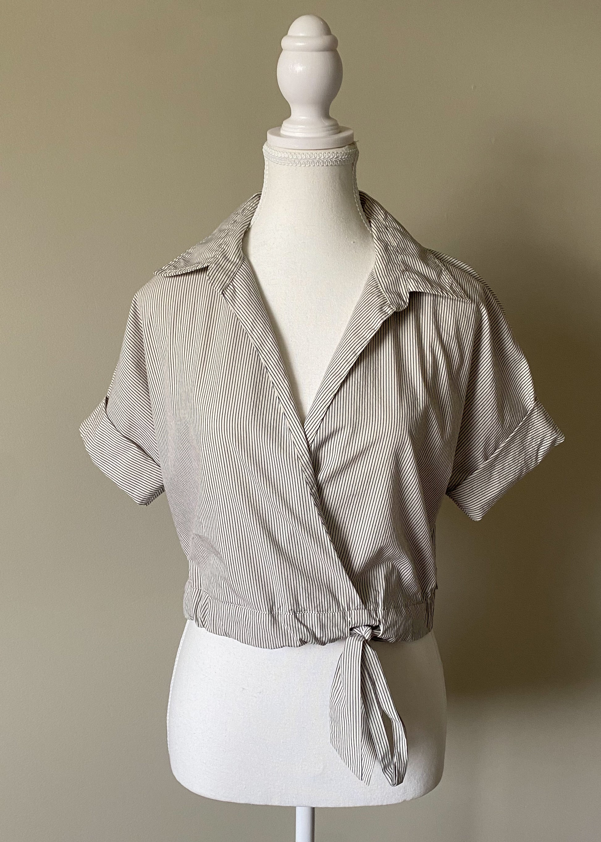 Features: Wrap style closure with single hidden button, collar, cuffed sleeves, tie at bottom front, elastic at bottom back, cropped length