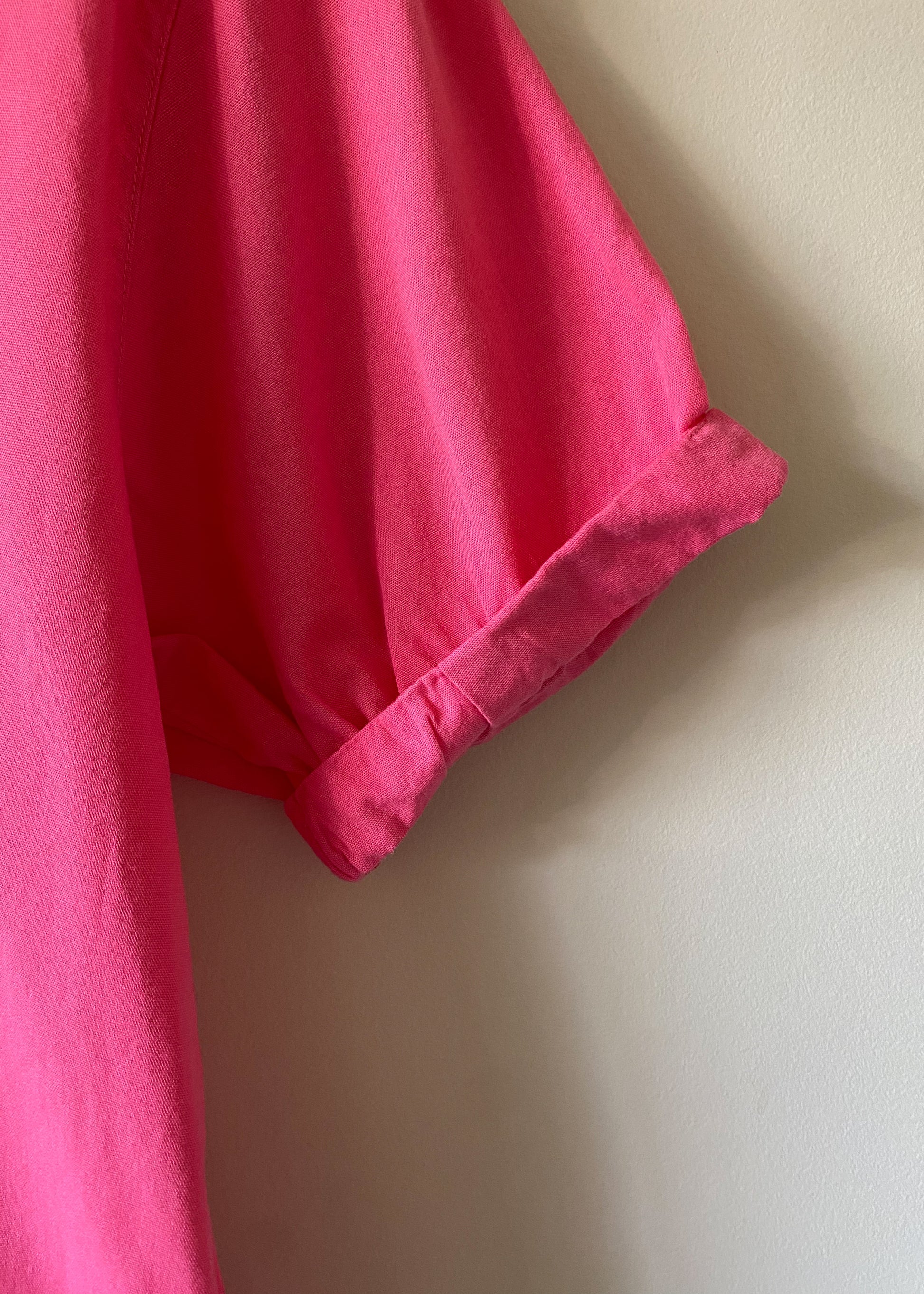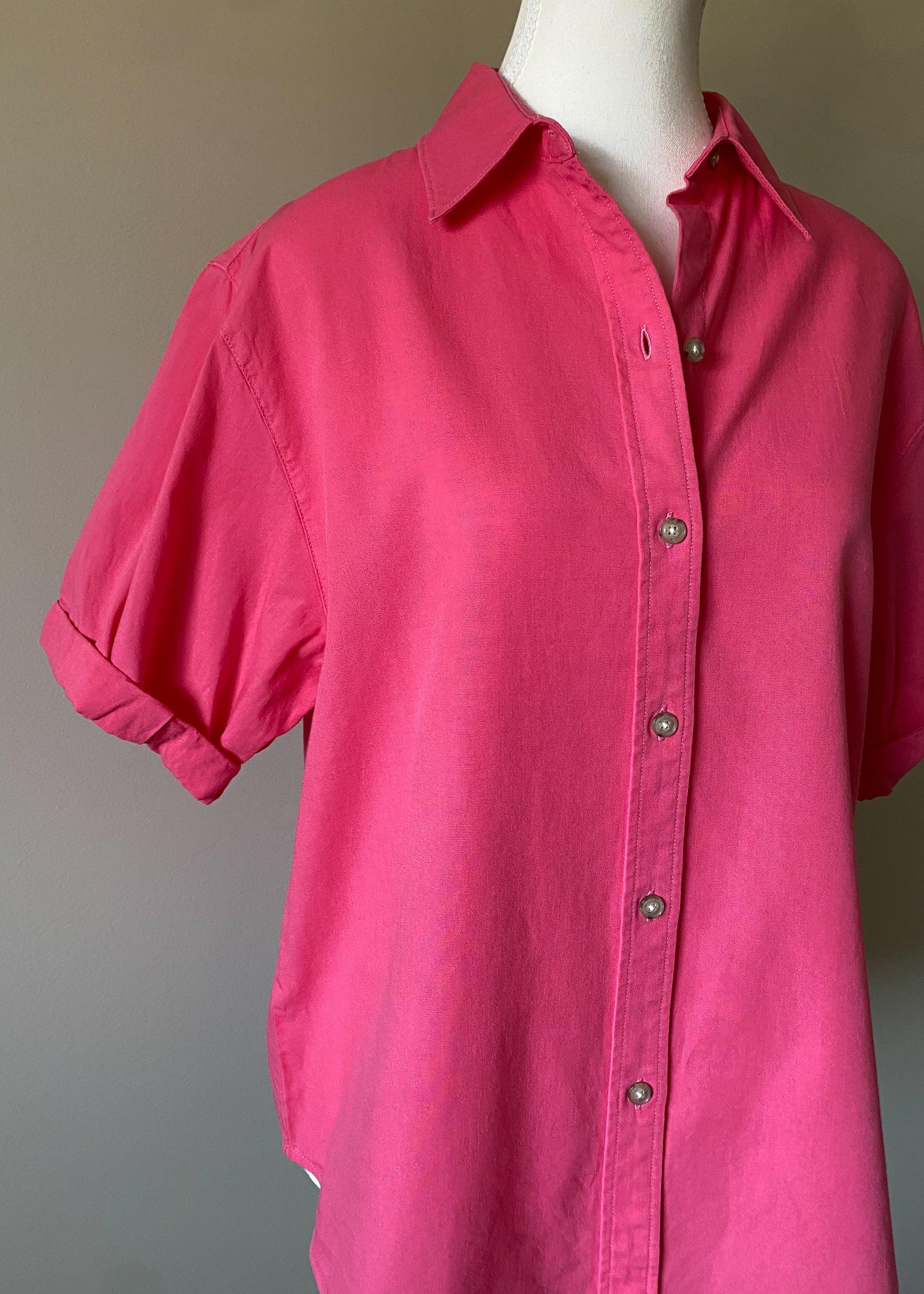 Features: Button front closure, collar, cuffed sleeves, rounded hem
